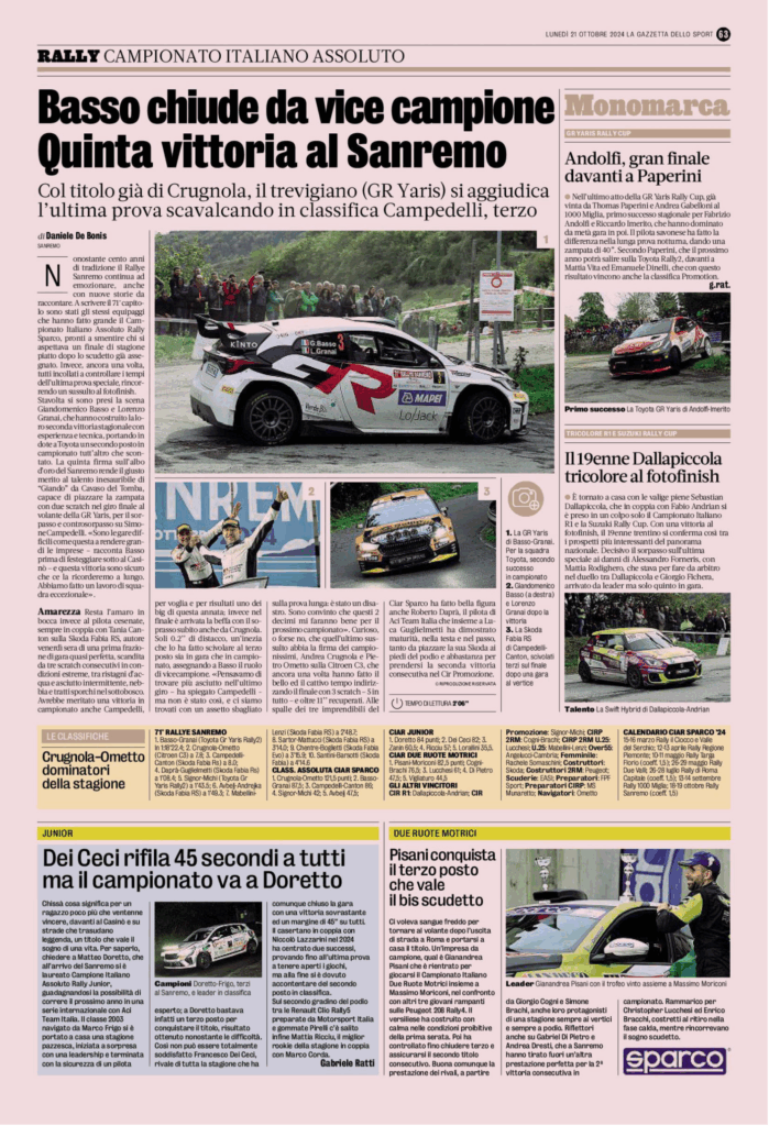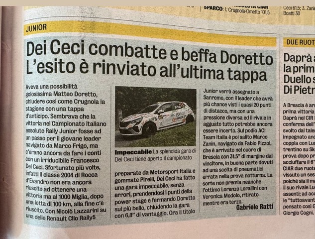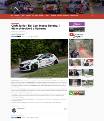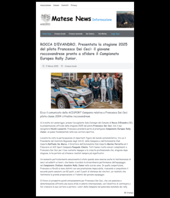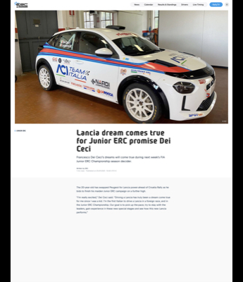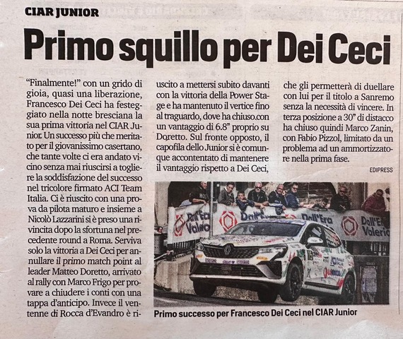 Gallery Rally Croazia 03 – 05 Ottobre 2025 Rally Barum 15 – 17 Agosto 2025 Rally Roma Capitale 04 – 06 Luglio 2025 Rally Poland 13 – 15 Giugno 2025 Rally Hungary 09 – 11 Maggio 2025 Rally dell’Adriatico 03 – 04 Maggio 2025 Rally Sierra Morena 04 – 06 Aprile 2025 Rally Il Ciocco 21 – 23 Marzo 2025 Rally 1000 miglia 2024 Rally Sanremo 2024 Video Gallery Dicono di me TeleuniversoROCCA D’EVANDRO: Dei Ceci al Campionato Europeo Rally Junior Aci SportACI Team Italia al via del FIA Junior European Rally Championship con Doretto e Dei Ceci Matese SportPresentata la stagione 2025 del pilota Francesco Dei Ceci: il giovane roccavandrese pronto a sfidare il Campionato Europeo Rally Junior. TeleuniversoMOTORI: Intervista Francesco Dei Ceci del 31-10-2024 Aci SportACI Team Italia – Dei Ceci e Doretto Rally TimeCIAR Junior: Dei Ceci blocca Doretto, il titolo si deciderà a Sanremo L’AutomobileERC Junior, ACI Team Italia brilla al Barum Rally con Dei Ceci e Lazzarini ERCLancia dream comes true for Junior ERC promise Dei Ceci